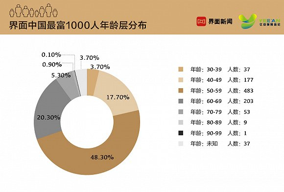 本次上榜的1000位富豪(37位未知年龄),平均年龄56岁。最年轻的是30岁的徐逸,来自2018年新上市公司哔哩哔哩。最年长的则是生益科技的唐翔千(96岁)。年龄在50-59岁的富豪共有482位,几乎占去半壁江山,人均财富100亿元;30-39岁的富豪共计37位,虽然人数占比只有3.70%,却持有6.10%的财富,该年龄段富豪人均财富达到183亿元,远高于榜单富豪平均财富111亿元。榜单中男性富豪占有绝对的优势,共有941位,女性富豪有59位。