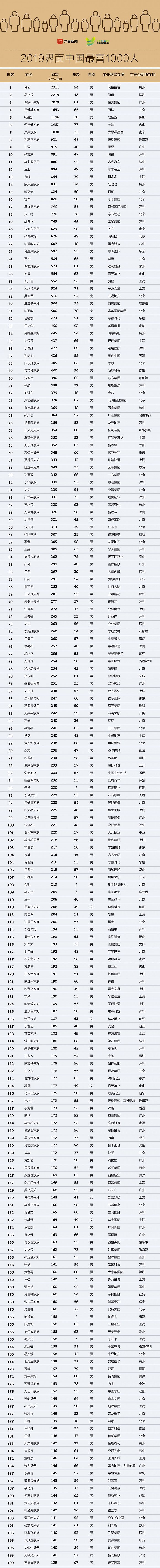界面发布2019中国最富1000人榜:凛冬望春,马云问鼎中国首富