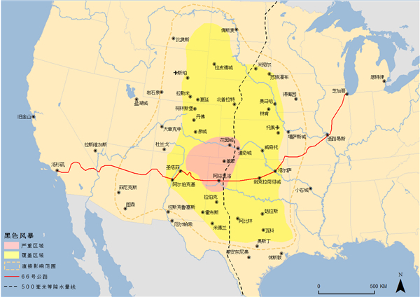 就在工人们因为大萧条而源源不断地涌上66号公路,前往西部参与工程建设,寻求新的工作的时候,他们的身后跟来了另外一群人。这群人走上66号公路是因为一场降临在美国中部大平原上的自然灾害,即美国历史上著名的环境灾难——烟尘碗事件(Dust Bowl,也叫黑色风暴事件)。在美国中部的大平原地下,有一个庞大的地下水层——高平原地下水层(High Plains Aquifer)。这个地下水层覆盖面积大,水量丰沛,而且距离地表不深,是美国中部农业的重要水源。
