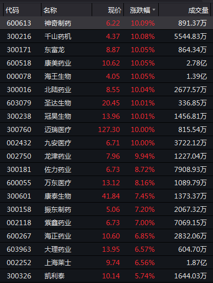 今日,医药生物股表现强势,神奇制药、千山药机、东富龙、康美药业、海王生物、北陆药业、圣达生物、冠昊生物、迈瑞医疗、九安医疗、龙津药业等多股涨停。