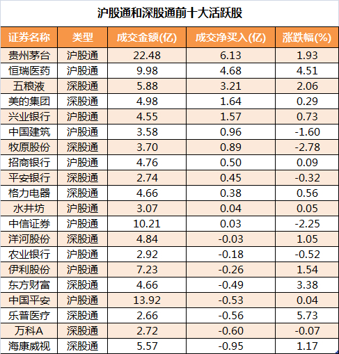 北上资金连续3个交易日保持净流入态势。Wind数据显示,今日北上资金净流入金额为28.40亿元。个股方面,贵州茅台、恒瑞医药、五粮液、美的集团分别获北上资金净买入6.13亿元、4.68亿元、3.21亿元、1.64亿元。贵州茅台获北上资金买入、卖出总额达22.48亿元,交易最为活跃。