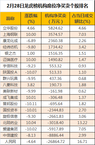 证券时报“数据宝”统计,龙虎榜中机构席位资金净卖出3.27亿元,其中,净买入的个股10只;净卖出的个股9只。立华股份被买入最多,净买入金额5825万元;机构净卖出最多的股票是人民网,净流出金额2.69亿元。