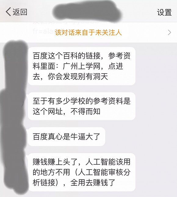 前两天,一位广州的家长在微博上发来私信,他发现:在百度中搜索广州的很多小学和幼儿园的名字,结果中排在首位的一般都是百度百科,而进入百度百科页面之后,点击参考文献中的“广州上学网”,却会进入色情网站。