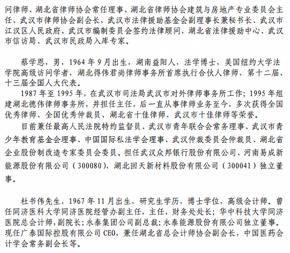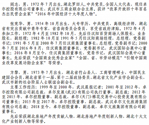 2019年2月28日公告称,汉商集团第九届董事会由九名董事构成:张宪华、张晴、杨芳、魏泽清、冯三九、方黎、魏明先(独立董事)、郭月梅(独立董事)、叶欣(独立董事),其任期原本将于2019年5月届满。但因公司股权结构发生变化,所以打算进行董事会提前换届选举。经汉商集团董事会提名委员会审核,同意股东卓尔控股有限公司(下称卓尔控股)提名阎志、张宪华为公司第十届董事会非独立董事候选人;同意股东阎志提名方黎、吴奇凌为公司第十届董事会非独立董事候选人;同意股东武汉市汉阳区国有资产监督管理办公室(下称汉阳国资)提名杨芳、冯振宇为公司第十届董事会非独立董事候选人;另外,同意股东汉阳国资提名郭月梅、胡迎法为公司第十届董事会独立董事候选人;同意股东卓尔控股有限公司提名蔡学恩为公司第十届董事会独立董事候选人;同意股东阎志提名杜书伟为公司第十届董事会独立董事候选人。