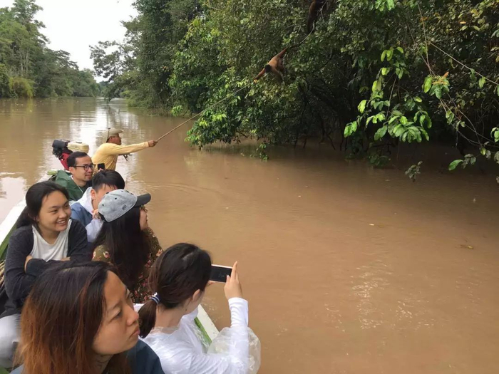 在三天两夜的行程里,他尽心尽责地帮助游客近距离地地看到更可能多的动物,获得更深度立体的丛林体验:他会用长长的木杆向野生的猴子投喂香蕉,从而让它们从高高的树梢来到河岸的枝叶上;
