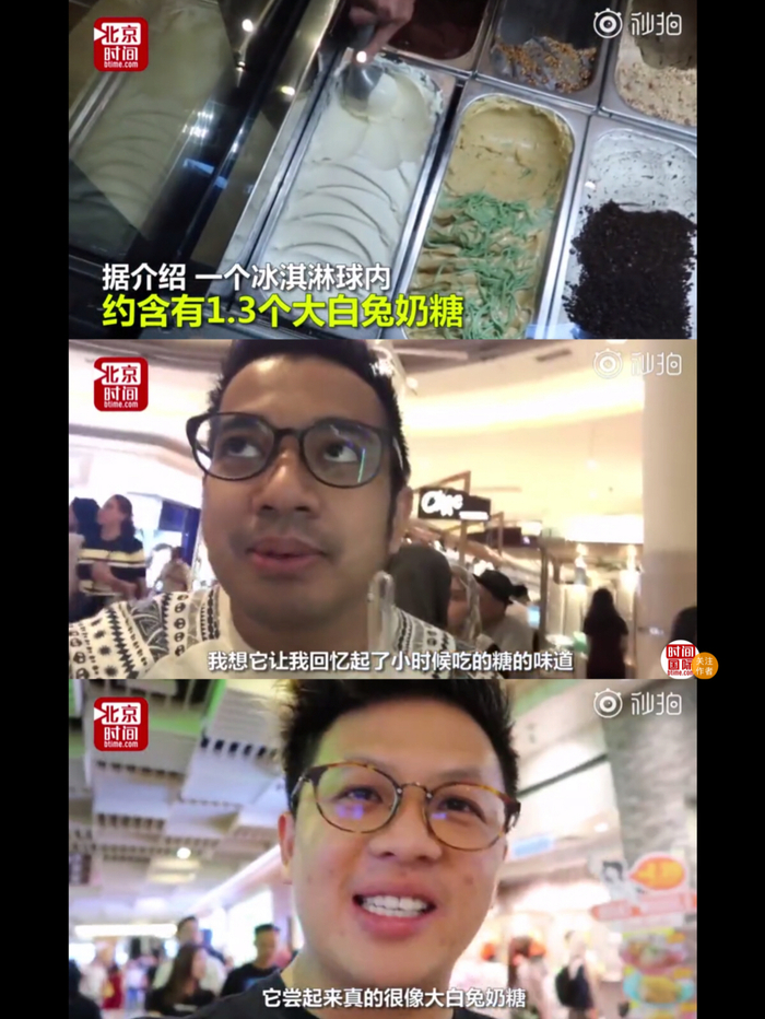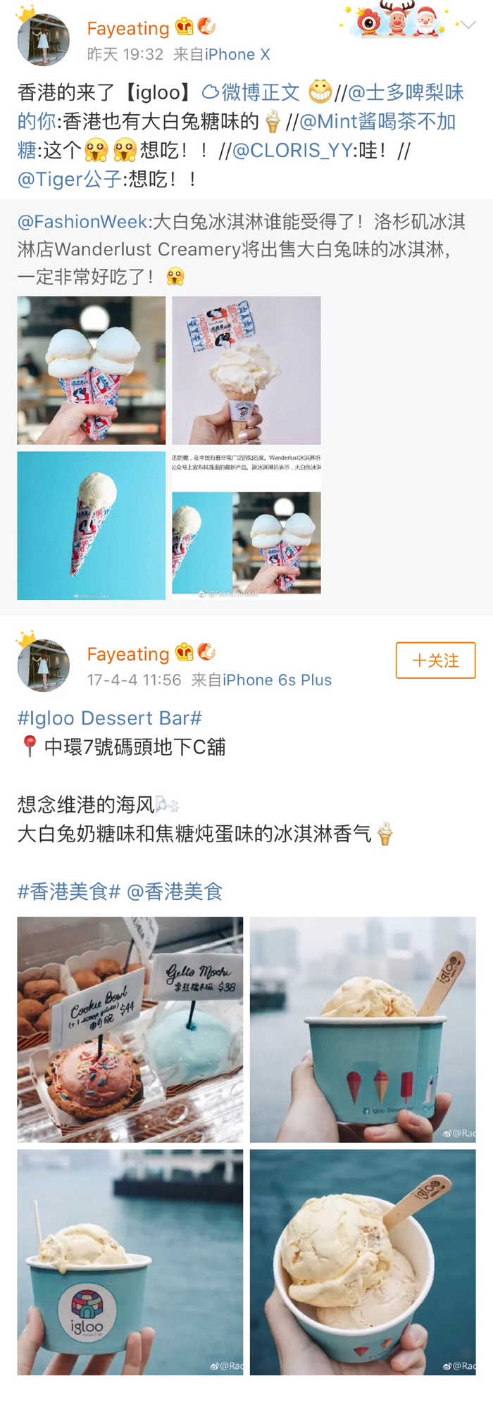 去美国太遥远,不少“大白兔”粉丝还扒出了位于香港的igloo雪糕店也有大白兔口味的冰淇淋,同样是将大白兔奶糖融合到冰淇淋中。
