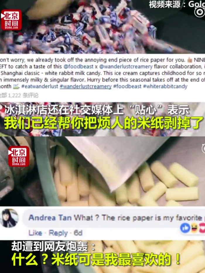 冰淇淋店在社交媒体上还“贴心”地表示:“我们已经帮你把烦人的‘米纸’剥掉了。”但这个举动大家不但不买账还遭到了“炮轰”:“什么?米纸可是我最喜欢的!”“我每次买大白兔奶糖就是为了米纸!”“我可以买你们剥下来的所有米纸吗?”对此,冰淇淋店回复:米纸没办法和冰淇淋放在一起,它会融化的。