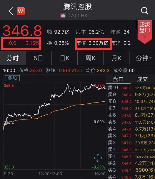 今天,腾讯股价不断上涨,截至收盘涨幅3.15%,报收346.8港元, 最新市值为3.3万亿港元,增加约1000亿港元。
