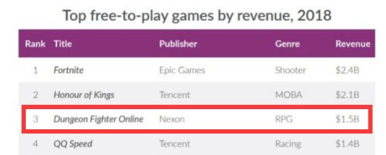 《地下城与勇士》成为Nexon在中国市场最大的摇钱树,2016年同时在线人数超500万,仍在为Nexon贡献巨额营收。2017年第一季度营收共计45.4亿元,《地下城与勇士》光是在中国区就贡献了27.4亿; 时至今日,《地下城与勇士》一年依然能赚到15亿美元,是全世界第三大赚钱的端游。SuperData统计,2018年收入最高的游戏中,Nexon的地下城与勇士位居第三位,收入达15亿美金,仅次于《堡垒之夜》和《王者荣耀》。