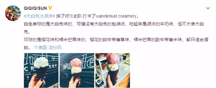 此后,从Wanderlust creamery的Instagram上得到消息的根据一些网友发布的视频,这家冰淇淋店前一度排起长队,许多消费者也自发在社交媒体上分享了与“大白兔冰淇淋”有关的信息。