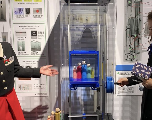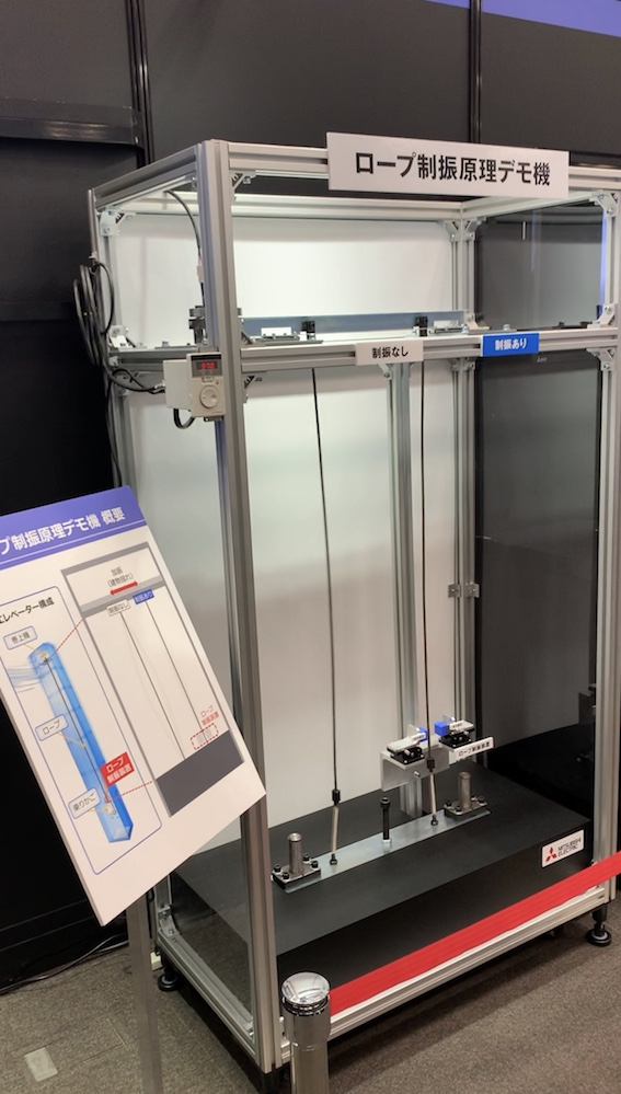 在一年一度的研究开发成果展示会上,三菱电机还展示了一个最新装置:当强风和长周期地震动发生时,其研发的“钢丝绳制振装置”可以抑制高层建筑的电梯曳引钢丝绳的晃动。