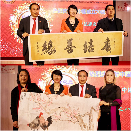旅欧画家李牧与旅法书画家黄银龙分别向法国华人贸易促进会送上精美的书画作品,祝愿协会拥有更加美好的明天。