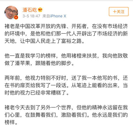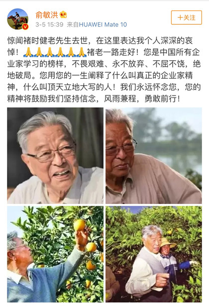 SOHO中国董事长潘石屹也发悼文称,褚时健是中国改革开放的先锋、开拓者。“他一直是我学习的榜样,他用褚橙来扶贫,我向他致敬做了潘苹果,跟随着他的脚步。褚老今天去到了另外一个世界,但他的精神永远留在我们心里,在鼓舞着我们,激励着我们。他永远是我们的榜样”。