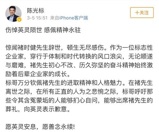 约莫十分钟后,江苏黄埔再生资源利用有限公司董事长陈光标也于社交平台上发文称:“惊闻褚时健先生辞世,顿生无尽感伤。作为一位标志性企业家,穿行于体制和时代转换的风口浪尖,无论顺遂与磨难,褚先生初心不改、历久弥坚的奋斗精神始终激励着后辈企业家的成长。”