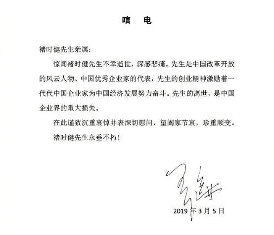 当日晚间,万达集团董事长王健林向褚时健亲属发唁电称,惊闻褚时健先生不幸逝世,深感悲痛。先生是中国改革开放的风云人物、中国优秀企业家的代表,先生的创业精神激励着一代代中国企业家为中国经济发展努力奋斗。先生的离世,是中国企业界的重大损失。