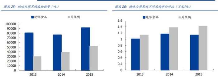 2013-2015年,绝味食品的采购量是周黑鸭的近两倍。从采购平均单价上来看,绝味食品 2013-2015年每吨采购价格分别为 1.00 万元、1.16 万元、1.13 万元,而周黑鸭每吨采购价格则为 1.14 万元、1.38 万元与 1.43 万元,绝味食品在采购成本端具有优势。
