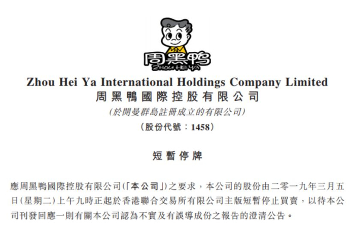 受此影响,3月5日,周黑鸭公告宣布停牌。