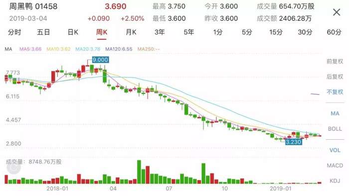 世殊时异,2018年以来,周黑鸭的业绩和股价都直线下降,让人跌破眼镜。周黑鸭2018年中期报告显示,去年上半年总销量较前年同期减少了1226吨。