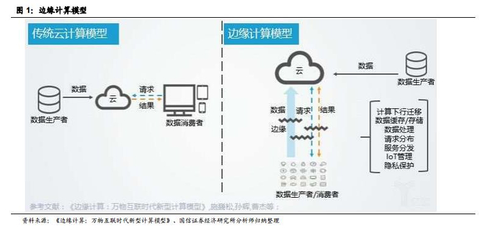 提出类似观点的还有国信证券,该机构称,相比于传统集中部署的云计算,边缘计算在靠近数据源或用户的地方提供计算、存储等基础设施,并为边缘应用提供云服务和IT环境服务。这样,边缘计算可以将高带宽、低时延、本地化的业务下沉到网络边缘,解决了时延过长、汇聚流量过大等问题,为实时性和带宽密集型业务提供更好的支持。所以5G时代,边缘计算将是建设5G网络边缘云的普遍模式。