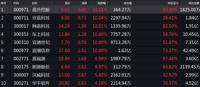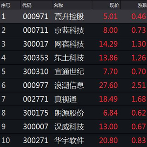 个股方面,高升控股(000971)、京蓝科技(000711)、网宿科技(300017)、东土科技(300353)、宜通世纪(300310)、浪潮信息(000977)、真视通(002771)、朗源股份(300175)涨停,汉威科技(300007)、华宇软件(300271)、东软载波(300183)等涨幅也居前。