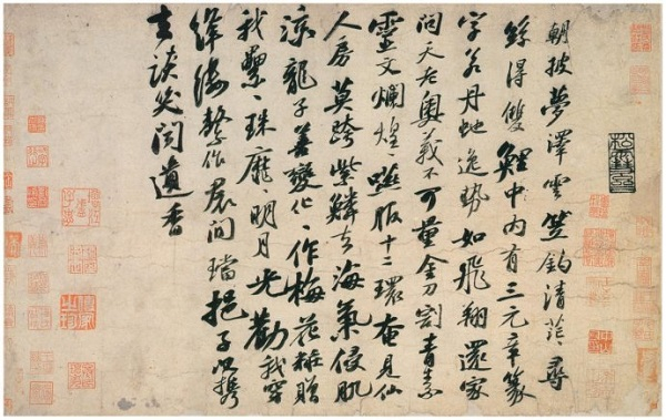 这一手卷落款为“元祐八年七月十日,丹元复传此二诗”,没有署名,但一看就是苏轼典型的书风。这两首李白诗,在李白的正集中没有收入,估计苏轼当时也没有读到过,所以欣然择上好佳纸写录。查上海古籍出版社瞿蜕园、朱金城校注《李白集校注》,此二诗收入卷三十“诗文补遗”,题为“上清宝鼎诗二首”,即录自此卷东坡墨迹。然而,中华书局孔凡礼整理点校之《苏轼文集》题跋卷中“记太白诗二首”,文字与此墨迹本基本相同,但也颇有不少出入。比如将“朝披梦泽云”写作“朝披云梦泽”等,显然不大贴切。