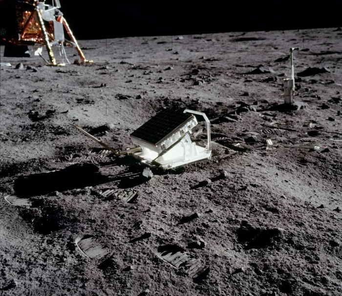 (阿波罗11号放置的激光反射器,可以将地球上射来的激光反射回去,通过测量往返时间,科学家发现月球正在以每年3.8cm的速度远离地球,图片源自@NASA)▼