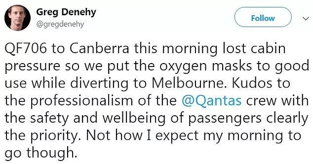 这位乘客表示,QF706航班今早在飞行过程中机舱失压,大家都戴上了氧气面罩。在此给Qantas机组最高赞誉,机组反应迅速,保证乘客安全。我的早晨没有像我想的那样。
