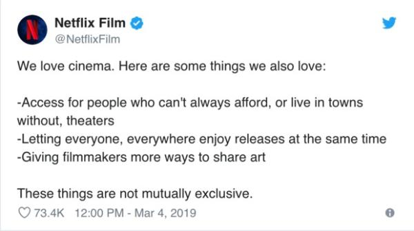 不可否认这段发言的积极和可取之处,看上去,Netflix和反对它的那些欧洲老牌电影协会目标一样,不过是在为观众和弱小的电影人们提供更多的机会。并且事实上,Netflix确实在支持小众电影上有所建树。正如《罗马》的导演阿方索·卡隆(Alfonso Cuarón)在接受采访时指出的:“(电影院)很难看到艺术片。也很难看到外语片。大多数影院都放好莱坞大片。”“你觉得一部黑白、西班牙语、没有明星的墨西哥剧情片能在多少电影院上映?你觉得它能得到多大规模的公映?我最后得到的播放规模可比那大了不止一点点,而且现在依然能点播。这对一部外语片而言简直太难得了。”