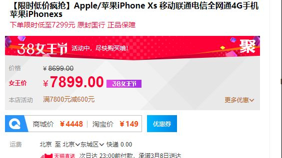 京东方面表示,iPhone XS Max官网价最高直降1700元,iPhone XS Max抢券低至7999元,iPhone XS抢券7399元起限时特惠。