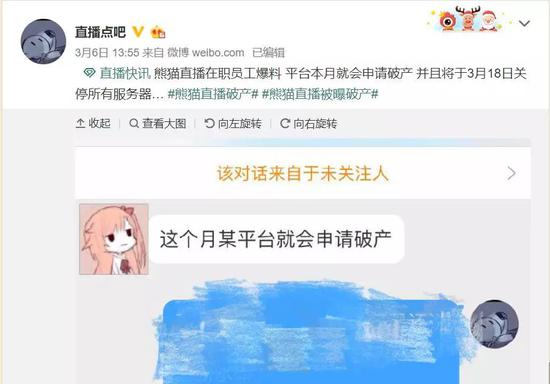 3月6日,有爆料称,熊猫直播本月将申请破产。熊猫直播人力资源管理人士在熊猫直播的员工群中称已经帮员工安排了头条、快手、花椒、映客等多家公司的用人需求。截至目前,熊猫直播目前尚未回应传闻。而有媒体今天报道,熊猫直播北京总部部分办公区已退租,不时有包括主播、供应商等人士前来讨薪。