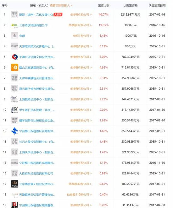 天眼查显示,熊猫直播共有19个机构和个人股东,背后有多家上市公司。珺娱(湖州)文化发展中心(简称“珺娱文化”)持股40.07%,该公司系王思聪全资持有。北京奇虎科技有限公司持股19.35%,该公司系三六零的孙公司。平潭兴证创湃文化投资合伙企业(有限合伙)持股5.08%,该公司GP方兴证创新资本管理有限公司系兴业证券子公司。天津中冀融智企业管理合伙企业(有限合伙)持股2.31%,该公司的大股东为中冀投资股份有限公司(简称“中冀投资”),而中冀投资的前两大股东分别是荣盛发展和养元饮品。