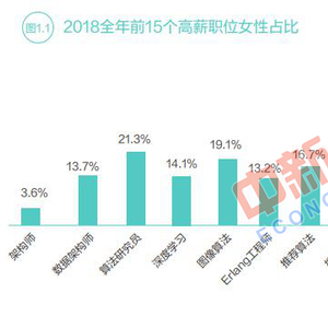 在2018全年前15个高薪岗位的女性占比中,除了排在第14位和第15位的战略咨询及证券分析师外,其余岗位女性占比普遍在30%以下。目前技术领域热度最高的机器学习、深度学习、图像识别、架构师等人工智能和大数据相关岗位,女性占比不足20%,甚至是个位数。女性在高薪技术类职位中的低参与率使得薪酬差异日益明显。而近年来,各领域商业模式红利减弱,行业巨头转向技术驱动,高级技术岗位薪资持续飙升,进一步强化了相关领域内高收入男性的薪酬优势。