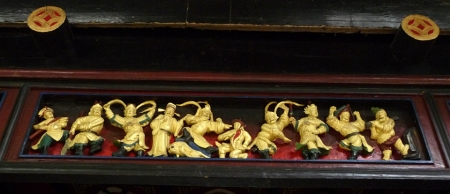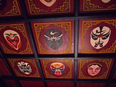 戏台台口左右华板上雕刻着戏剧故事《白蛇传》中的“船舟借伞”和《西厢记》中的“莺莺听琴”,人物形神毕现,栩栩如生。台上悬挂“颂择九州”匾,台前立柱上有一副对联:“移影换形俨然君臣父子,假哭真笑表达离合悲欢”,构思精妙,立意深刻。木格硬天花上彩绘着各种戏剧人物脸谱,烘托浓烈的戏剧氛围。