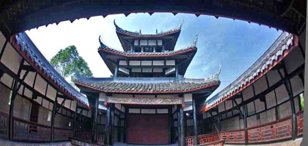 在如此森严的城堡里,段襄臣又别出心裁地修建了戏楼,而戏楼的风格却讲究简朴和实用。没有雕梁画栋,没有木雕撑拱和吊瓜,没有“几字罩”和拦板,巴蜀戏楼所应有的华丽装饰都与这座戏楼不沾边。这让人百思不得其解,富甲一方的“段半县”为何这般小气?在巴蜀寺庙、祠堂、会馆建筑中,戏楼历来都是重中之重,特别讲究戏楼装饰的繁复,以显示强大的经济实力和文化实力。不难理解,因兵祸匪患频频,段襄臣倾其财力修建寨堡式住宅,目的是为了“保全身家”,建筑和设施讲究实用,极少华丽。在戏楼之上再建两层楼台,也体现段襄臣的实用理念,既作登高观景之胜,又作兵匪侵扰的瞭望台。观景台下面是戏楼,天井两侧的回廊联系着观戏楼,形成了城堡独立的娱乐中心。有了坚固的城堡庇护安全,段襄臣还考虑到族人的精神文化生活。建个戏楼,请戏班子唱唱戏,让族人们在动荡不安的社会中也享受享受生活的乐趣。