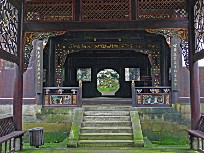 戏台前宽阔的工字厅可摆茶设座,廊道两侧是美人靠,是女眷休息和看戏的专座。过厅作为“戏台”,这种建筑形制在四川盆地几近孤例。黄中美可能更喜欢这种随意、自然、互动的家庭娱乐形式,它不拘一格,方便随意,颇有创意。观者随置坐椅于廊下,主客同乐,一边品茗一边看戏。若无戏班演出,票友亦可登台唱戏,互相切磋,其乐也融融。黄中美主持第三次修建,给庄园注入了更多的戏剧艺术元素,使庄园成为名副其实的书香门第。