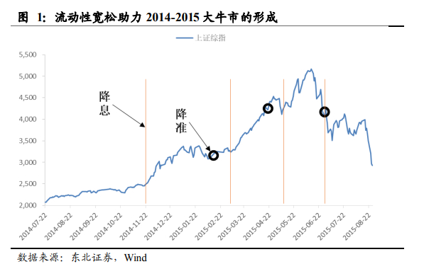 本文主要对最近的 2014-2015 年牛市券商股表现进行详细复盘。2014-2015 年流动性宽松带来的大牛市是继 2007 年后又一次资本市场的盛宴,但惨烈的下跌过程同时也给投资者带来巨大的创伤。事实上,创业板的牛市早在 2012 年末就已经开启,整个 2013 年创业板已经上涨了 82.73%,同期的上证综指下跌了-6.75,创业板强主板弱的状态一直持续到 2014 年年中。直到 2014 年 7 月份,上证开始持续上涨,从7 月中下旬到 11 月初,累计上涨接近 20%;随后在 11 月 22 号央行拉开了此轮降准降息的大幕,指数开始不断向上突破。上涨行情在 2015 年 2 月开始盘整,但在春节后进一步降准降息的实施和政策利好的频现,上证最终冲击到 6 月 15 号的 5178点,然后进入到了股灾阶段。纵观 2014-2015 大牛市的起落,券商股同样经历了急涨急跌,我们在复盘中也可以得到一些有意义的结论。
