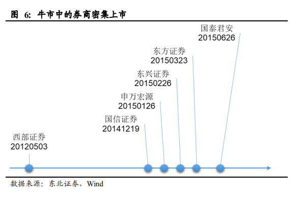 牛市期间证监会发审委 IPO 放行速度也会加快,在 2014-2015 牛市上行过程中,国信证券、申万宏源、东兴证券、东方证券和国泰君安陆续上市,其中在牛市上行过程中发行的四家券商中,除了申万宏源很快开板再未回到高点外,国信、东兴和东方在开板后最高又分别取得了 59%、81%和 91%的涨幅。所以从 2014-2015 年牛市的经验来看,除了流通盘小(西部证券)容易被爆炒外,在期间上市券商开板后追入的胜率和收益也都是很高的。