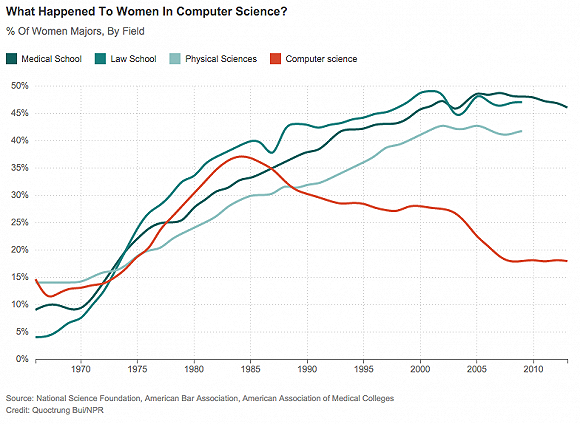 上图代表了从 1965 年至 2015 年美国女性在高校不同专业人数的变化。红色曲线为计算机学科女性数量