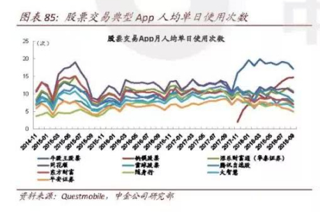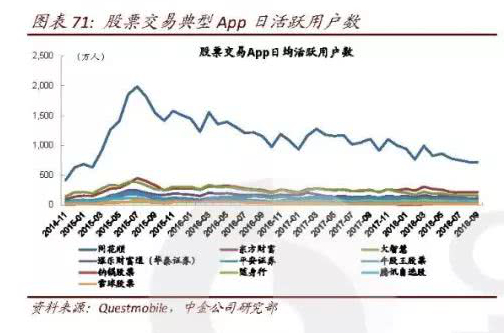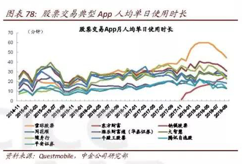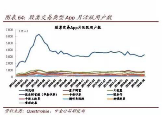 同时,通过中金公司研究数据可以发现,互联网证券服务平台已经占据股票交易市场半壁江山,并逐渐形成对头部股票交易平台的挑战,包括牛股王、雪球、腾讯自选股、钠镁股票等新生代证券服务平台,无论用户量还是活跃度都在2018年的股票弱市中逆势坚挺。