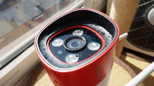 笔者将水直接浇在360红色警戒版上,以次来模拟大雨的情景。360红色警戒版完全经受住了考验,摄像头也没有收到影响。