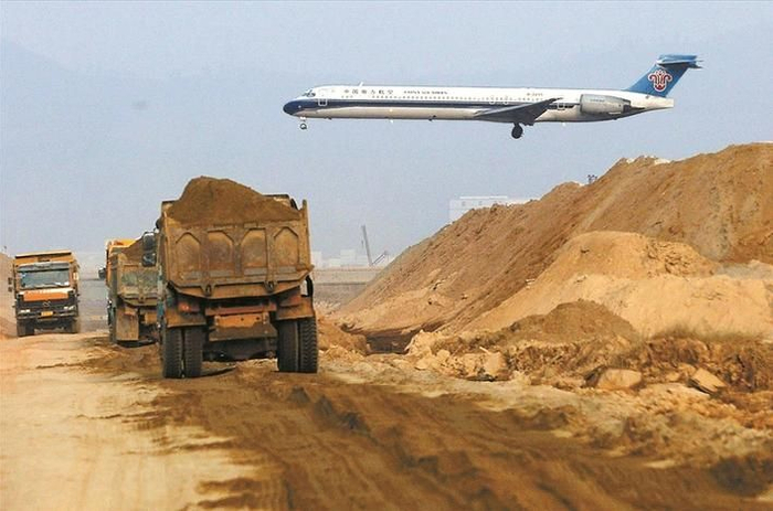 图:2008年5月,深圳机场扩建工程如火如荼地进行,一架飞机飞过泥头车作业的工地。刘廷芳 温文锋/图