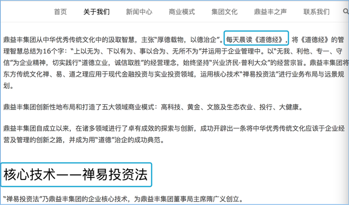 鼎益丰集团官网称,这种“禅易投资法”是将禅理、易理与股票、黄金、期货、基金、项目投资等相结合,预测金融投资的各种变化,“通过禅定的修习和易理的变换,把金融投资中复杂的计算问题,转换成容易计算和解决的简单问题。”