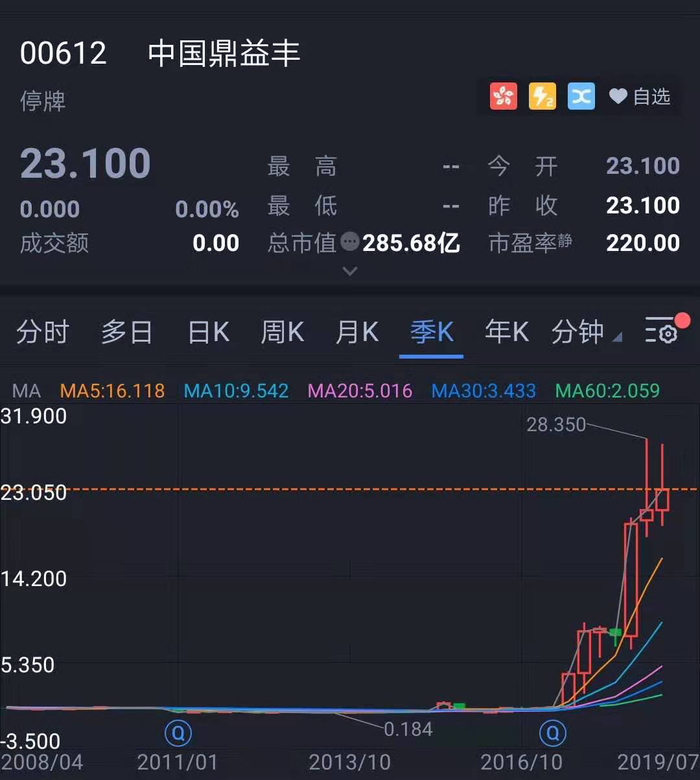 2018年11月2日,当时公司名字还叫“中国投资基金国际控股有限公司”的中国鼎益丰在盘中股价达到了其历史最高值——28.35港元。往前倒推不到三年,即2016年1月份的某一个交易日,这个股票的收盘价格仅为0.281港元,这意味着,三年不到的时间里,其股价上涨了100多倍。
