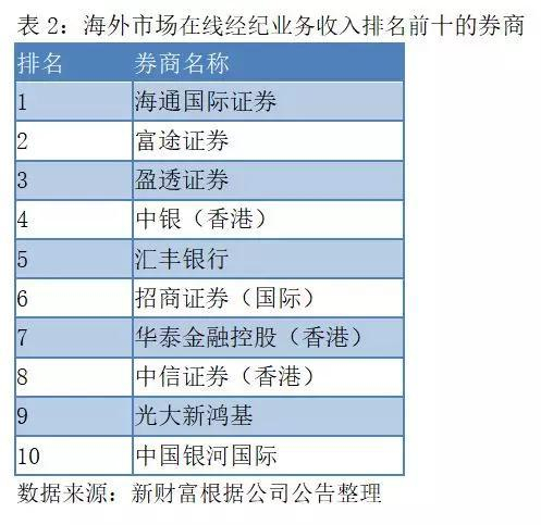富途将目标放在海外市场,该领域来自内地的实力玩家众多。按照2018年上半年在线经纪业务收入规模计算,中国内地投资者使用的10大海外在线证券公司包括海通国际、招商国际、中银香港、汇丰银行以及盈透证券,其中富途排在第二位,第一名是海通国际证券(表2)。