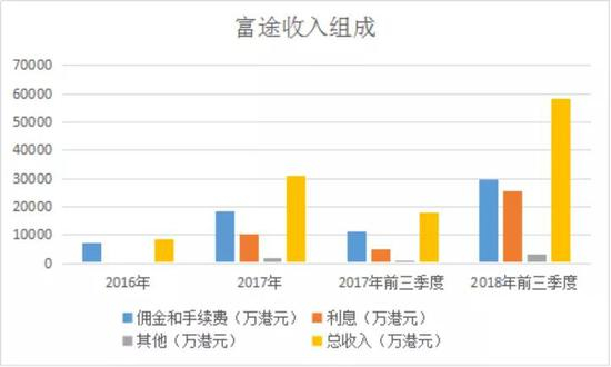 截至2018年9月底,富途保证金融资余额大约为36亿元港币,证券借贷余额为3.5亿元港币。2016年至2018年前三季度,富途来自保证金融资和证券借贷服务占总收入分别为2%、21%和30%,占比快速上升。