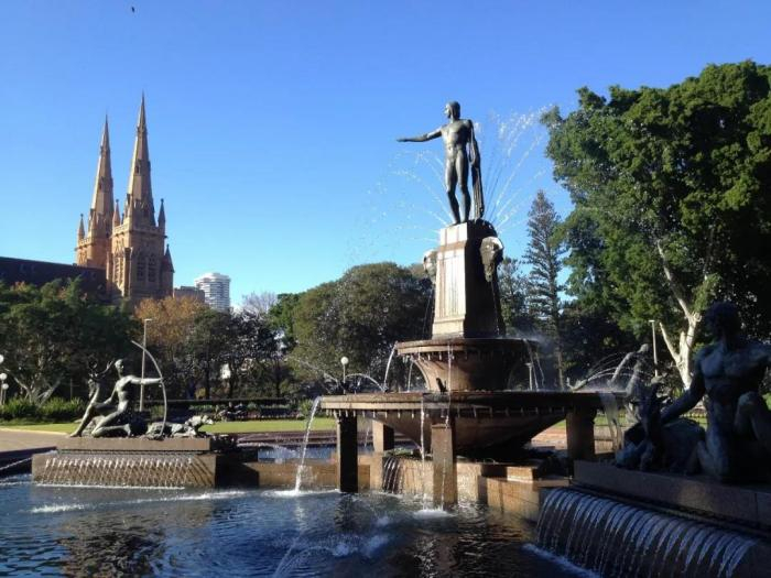 海德公园,位于悉尼市中心,是一块闹中取静的长方形绿地,园内各处分布着雕塑、喷泉、池塘、小湖,有大片洁净的草坪,也有百年以上的参天大树,是这里休闲的一个好去处。