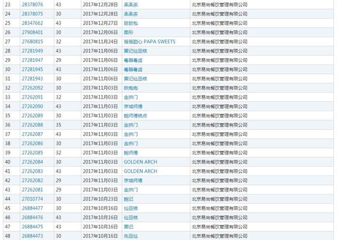 新京报记者查询发现,除“鲍师傅”外,易尚公司目前申请注册的商标还有“金拱门”“原麦丰秋”“沙县轻食”“楽楽茶”“脏脏包”“仙豆糕”“爸爸甜心”等,与麦当劳、原麦山丘、沙县小吃等多个知名餐饮、茶饮、烘焙品牌十分相似。