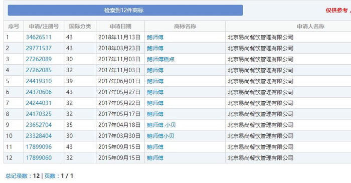 新京报记者注意到,尽管易尚公司目前尚无糕点类的“鲍师傅”相关注册商标,但其官网搜索关键词为“鲍师傅糕点全国总部”,网站首页显著位置有多张糕点产品的宣传图片,并配以“鲍师傅,火爆北京、上海、天津的网红美食”。在企业介绍中,易尚公司也称其经营理念为“融合国际烘焙先进管理模式,打造中国西式糕点连锁品牌”。