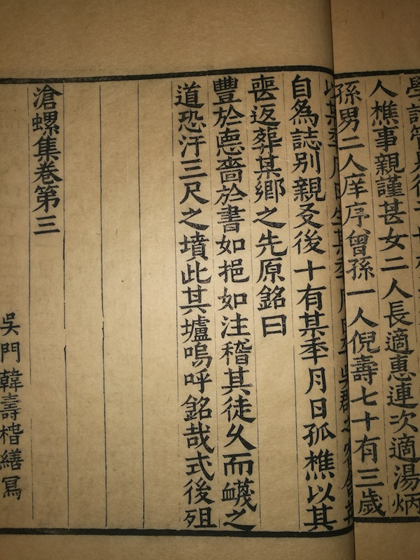 汲古阁本《沧螺集》以弘治刻本原样覆刻,甚至连原本的写工名“吴门韩寿春缮写”也照样复制下来