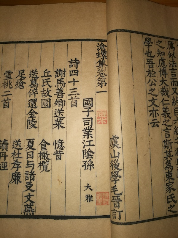 《沧螺集》,孙作著。孙作,字大雅,元末明初江阴人,为当时著名文学家。《明史·文苑传》称赞其文“醇正典雅”,宋濂对孙作之文也有很高的评价。此六卷本《沧螺集》为孙作诗文集现存唯一版本,具有重要的文献价值。此书流传稀少,向称难得,黄永年先生曾多次讲到汲古阁刻本中的稀见书,均举了此书为例。如在《古籍版本学》第七章“明刻本”中,黄先生明确写道:“从文物角度来说,则汲古阁所刻《列朝诗集》、《道藏八种》、《沧螺集》等一向稀见,次一点如《元人十种诗》、《四唐人集》、《唐诗纪事》、以及《十三经注疏》、《十七史》、《津逮秘书》等大部头书之完整早印者也较为难得。”近代大藏书家傅增湘曾得此书一部,他在《藏园群书题记》中说:“汲古阁所刊别集多在丛刻中,其单行者惟元之《牧潜集》,明初之《清江碧嶂集》及此集而已。然此三集者,以传世无多,故购求亦匪易。余生平喜收汲古阁刻书,大率略备,圆至、伯原二集夙已得之,独《沧螺集》求之积年,幸见一帙,卒为他人所先,常引以为憾。兹垂老乃复获之,亦可谓有古缘矣。”以傅增湘先生当年见闻之广博,购书条件之优越,还要“求之积年”,垂老方得一部,就很可以想见其罕见程度了。